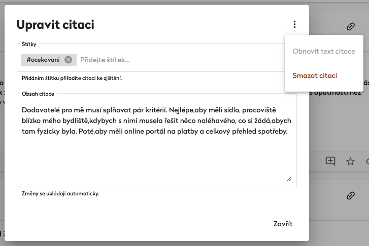 Citaci můžete smazat tak, že kliknete na zvýrazněnou citaci a v kontextovém menu (pod třemi tečkami v pravém horním rohu) vyberete možnost Smazat citaci.