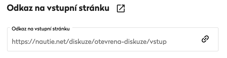 Do otevřené diskuze se může zaregistrovat každý, kdo má odkaz na vstupní stránku. Tento odkaz, který získáte na stránce administrace diskuze v sekci Vstupní stránka, je možné poslat konkrétním respondentům e-mailem nebo ho například nasdílet na sociálních sítích.